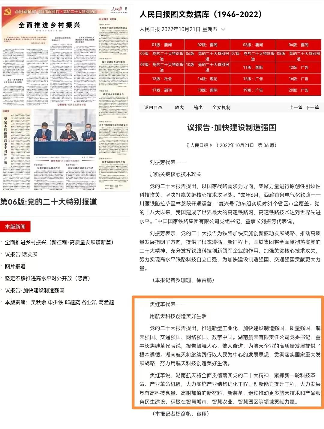 黨的二十大報告提出,推進新型工業(yè)化,加快建設(shè)制造強國、質(zhì)量強國、航天強國、交通強國、網(wǎng)絡(luò)強國、數(shù)字中國。湖南航天有限責任公司黨委書記、董事長焦繼革代表說,報告鼓舞人心、催人奮進,為航天企業(yè)的高質(zhì)量發(fā)展提供了根本遵循。湖南航天將繼續(xù)踐行以人民為中心的發(fā)展思想,貫徹落實國家重大發(fā)展戰(zhàn)略,努力用航天科技創(chuàng)造美好生活。