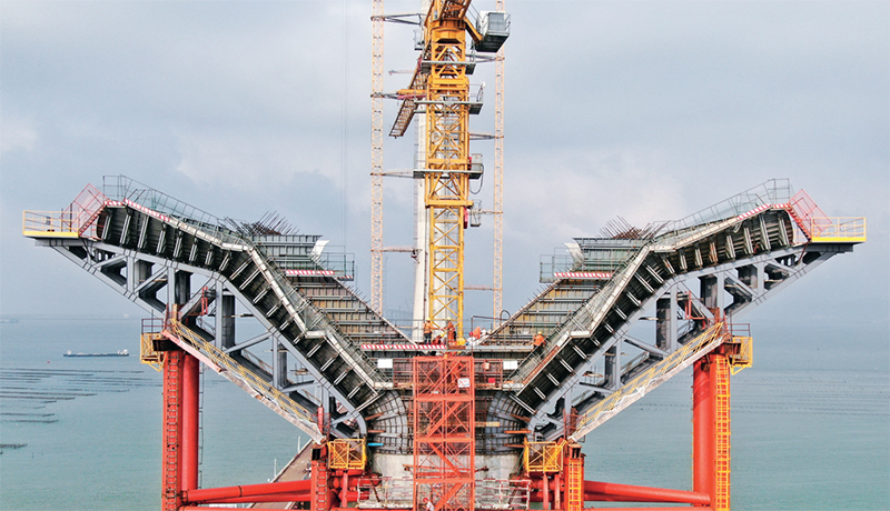 中央企業把主題教育與貫徹中央重大決策部署結合起來,切實抓好服務構建新發展格局戰略任務。黃茅海跨海通道是繼港珠澳大橋、深中通道之后,粵港澳大灣區又一跨海通道工程,由保利長大承建的黃茅海大橋中塔于2023年4月18日順利封頂。圖為4月17日,工人在黃茅海跨海通道黃茅海大橋進行墩柱基樁建設。 新華社記者 鄧華/攝