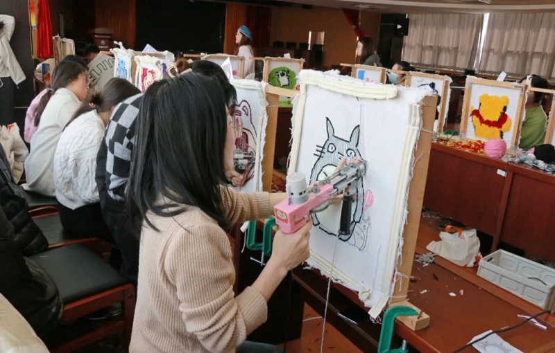 3月8日,為增加節日氣氛,展現新時代巾幗風采,河南航天本部工會開展了慶祝“三八”國際婦女節簇絨毛毯DIY活動。隨著機器響起,映入眼簾的是女職工拿起簇絨槍在一張簇絨布上扎扎戳戳。在老師的指導下,大家逐漸找到訣竅,投影描繪、挑選毛線、運作簇絨槍、刷乳膠貼布、修整鏟平……簇絨槍“突突”的聲音和大家驚喜歡快的談笑聲交織著,奏出一曲明快奔放地交響樂。經過不懈的努力,心儀的圖案也一點點變成柔軟的展現,琳瑯滿目、豐富多彩。